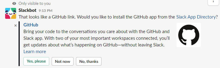 다음과 같은 메시지가 보인다면 연결에 성공한 것이고 앞으로는 Slack에서 해당 Repository의 변경사항을 알림받을 수 있게 된다.
