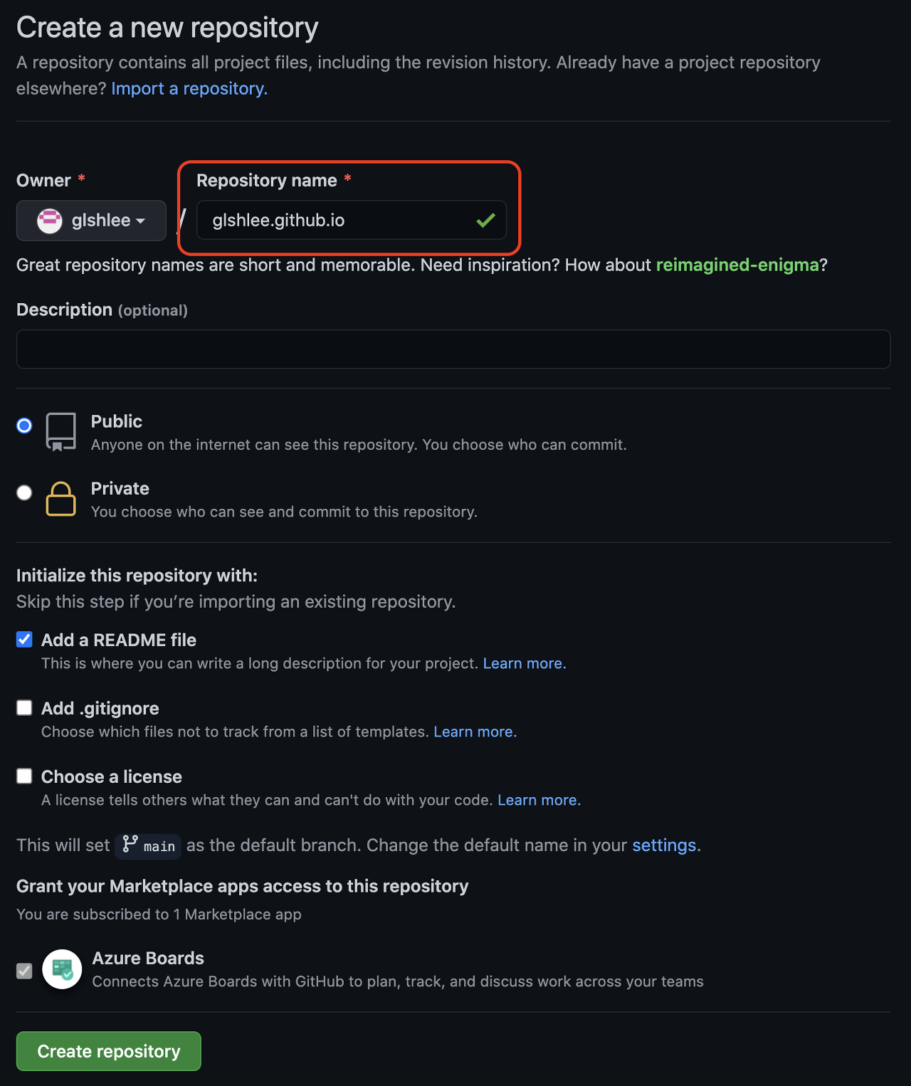 Repository를 만들 때 Repository name은 꼭 {본인 ID}.github.io 로 입력합니다. 적당한 옵션들을 선택하고 Create repository 버튼을 눌러 Repository를 생성합니다.