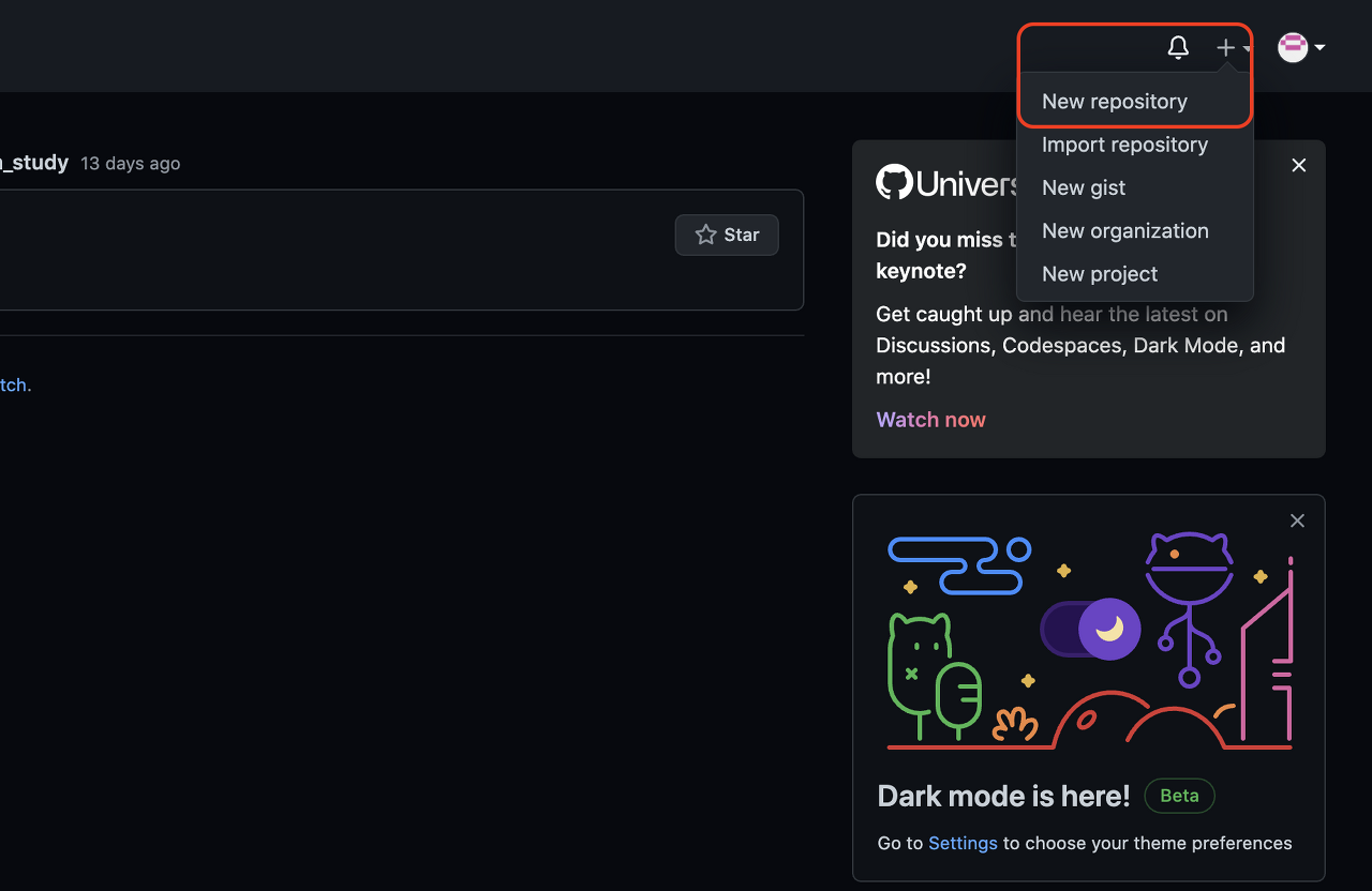 GitHub에서 New Repository를 선택하여 생성 페이지로 이동 합니다.