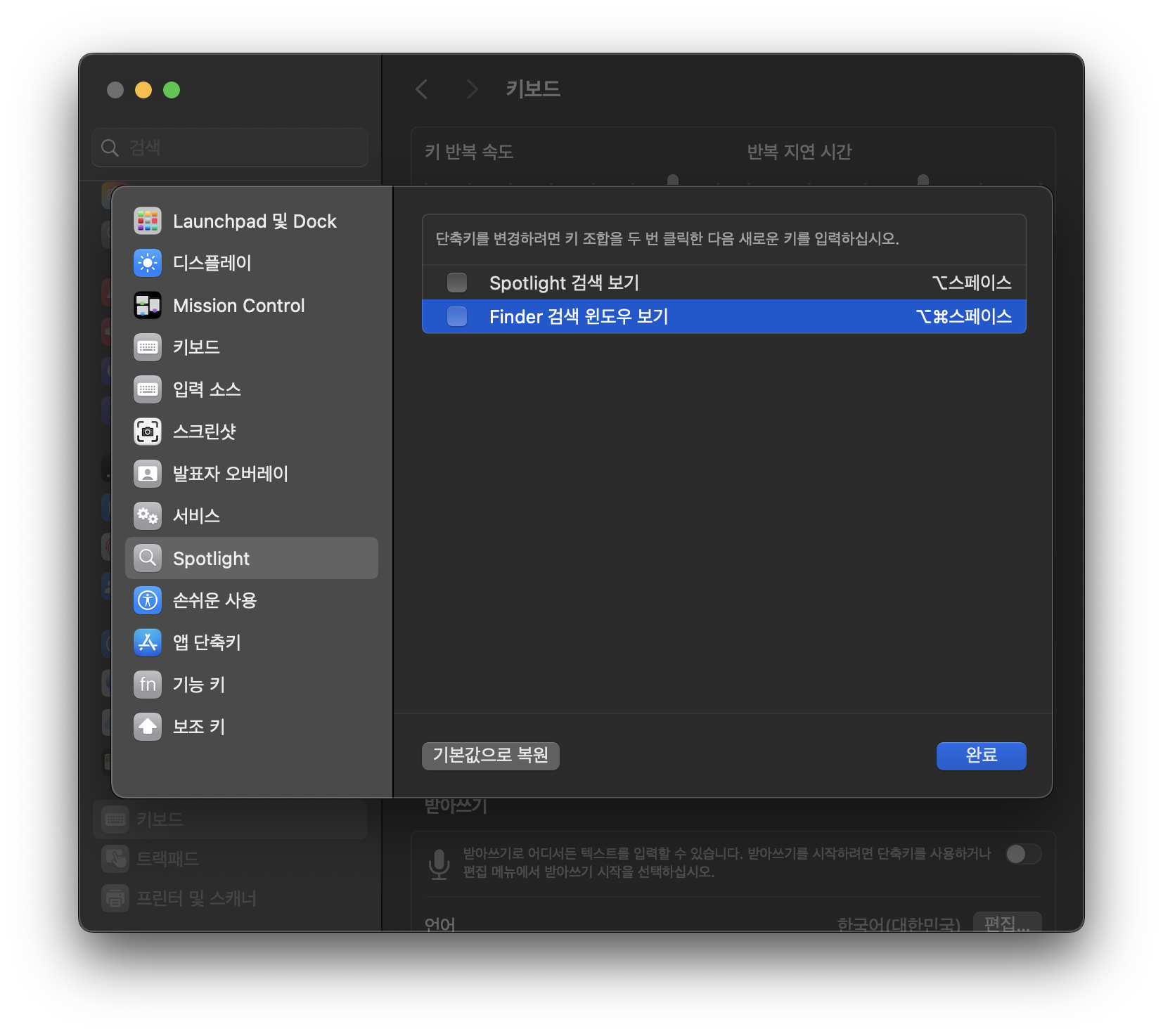 - 왼쪽 목록에서 Spotlight를 선택