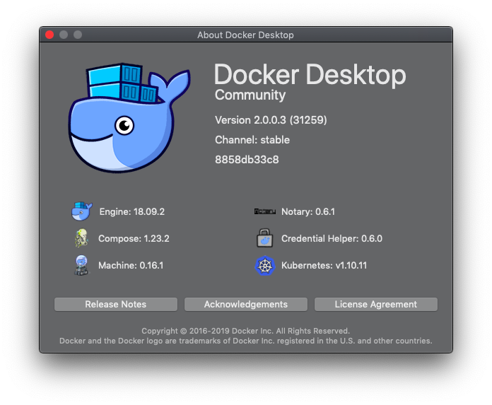 또는 About Docker Desktop 창을 열어 확인할 수도 있다.