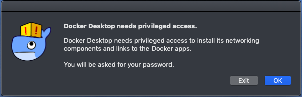 이제 응용 프로그램의 Docker를 더블클릭하여 실행시키면 액세스 권한을 요청한다. 패스워드를 입력하여 다음으로 진행한다.