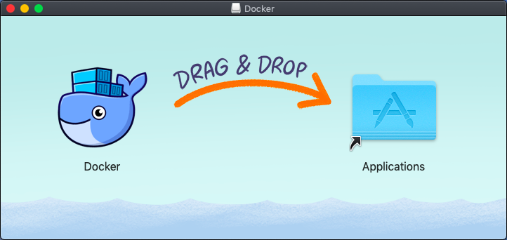 다운받은 Docker 이미지를 더블클릭하면 아래와 같은 화면을 볼 수 있다. 고래를 드래그 앤 드롭으로 애플리케이션에 옮긴다.