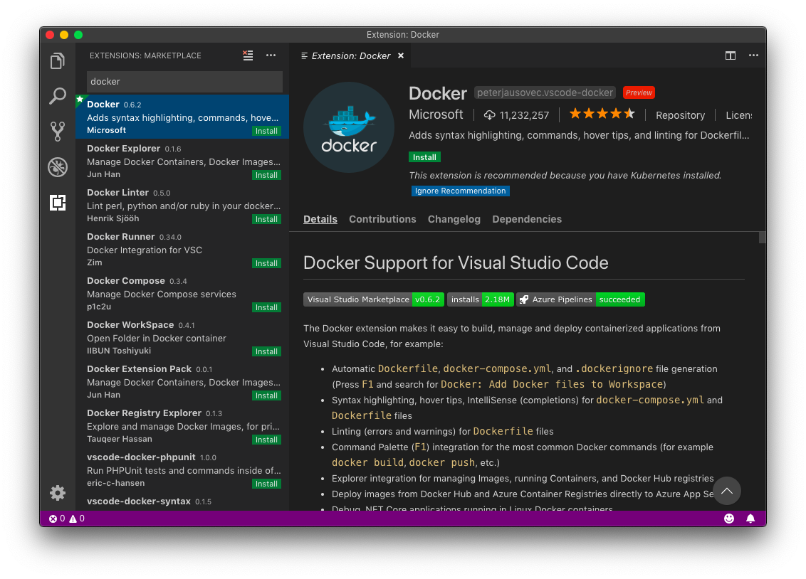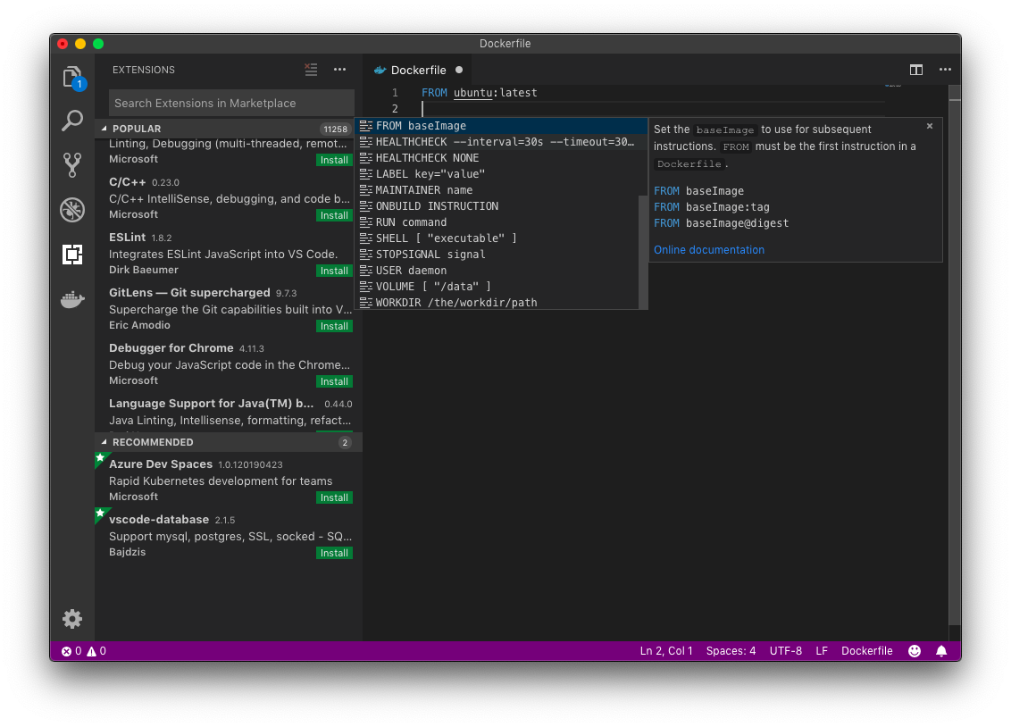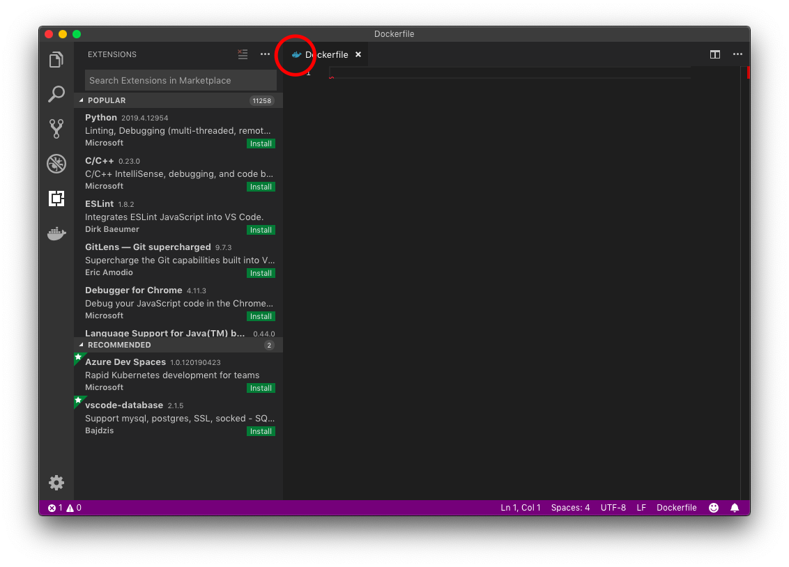 VS Code를 사용하여 Dockerfile을 쉽게 만들기 위해서는 extension을 설치해야 한다.